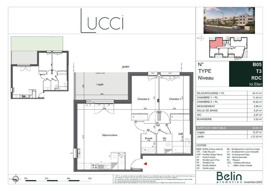 68.88 m² | RDC | 5 299 € | 365 000 € | 5 % | LOGGIA 12.37 m² Jardin 27.50 m² |